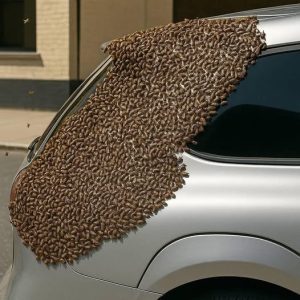 If you ever come across a car, tree, wall, or any surface covered with bees like in the photo, don’t panic! This is a natural phenomenon called swarming, and it’s essential for the survival of bee colonies.
